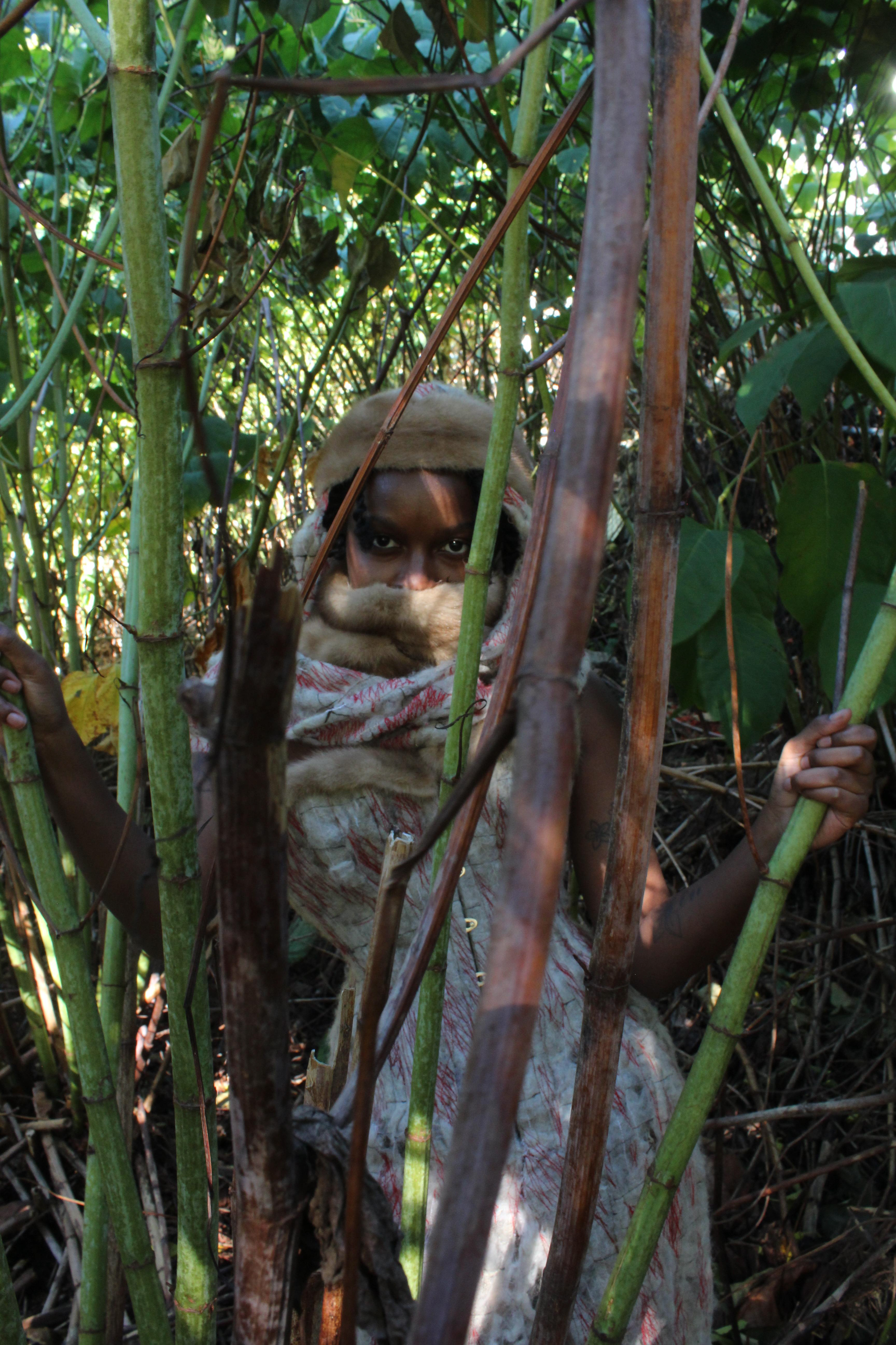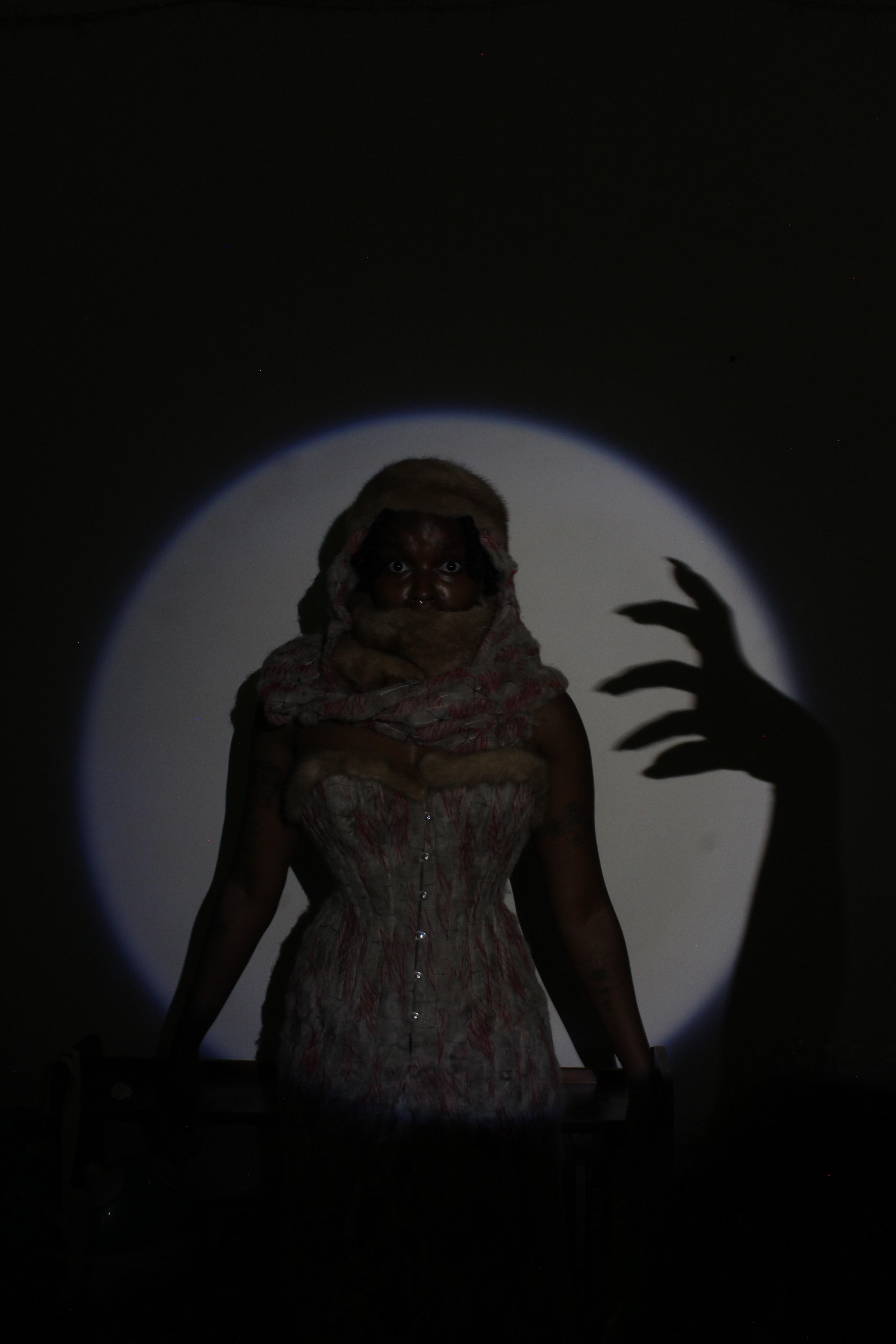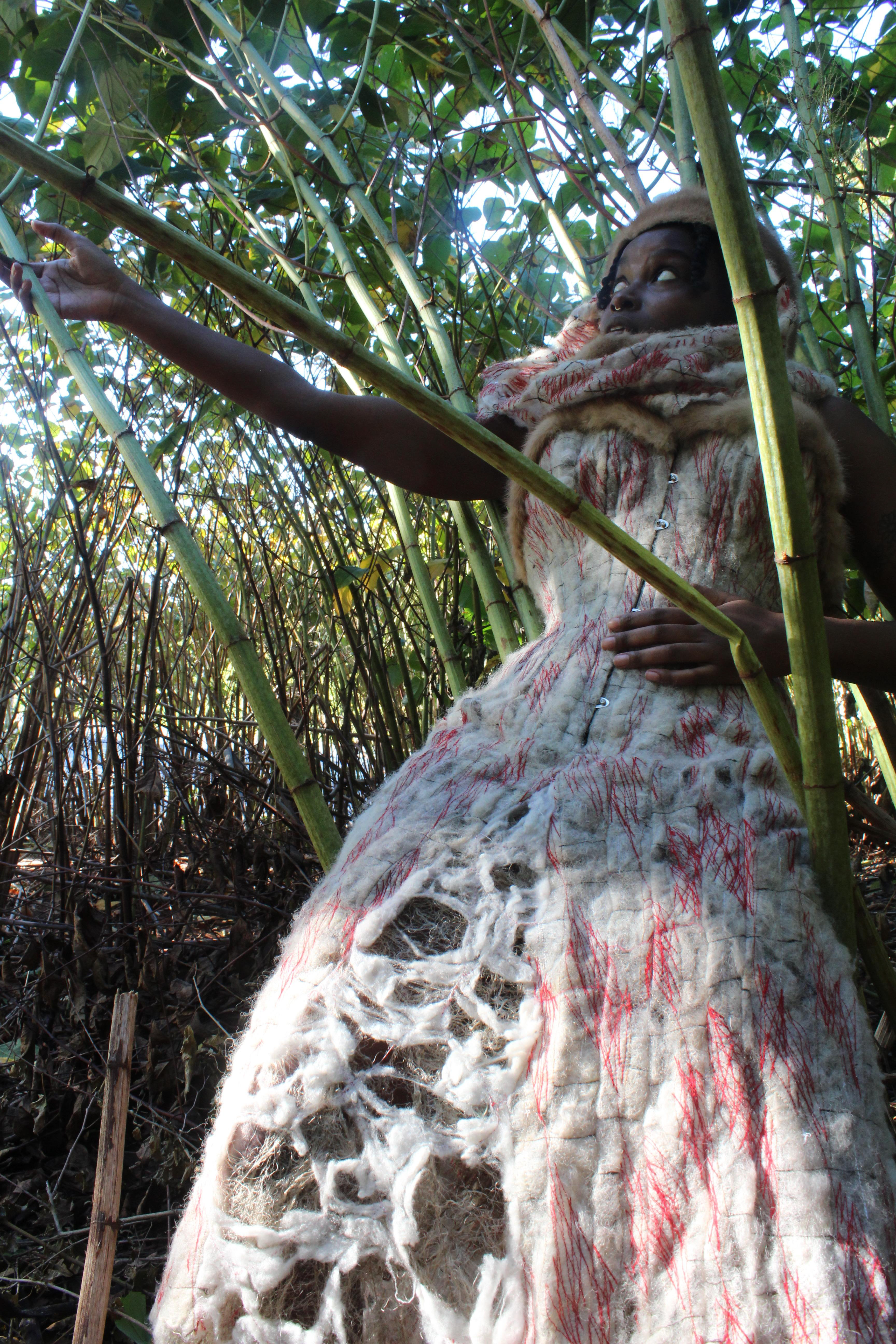 Shorn is a garment created from remnants of entirely natural fibers. The core and lining of the corset is constructed from a silk satin purchased as a remnant; shell and hood from hand shorn wool, machine embroidered with silk thread; underskirt comprised of deconstructed silk satin fibers from corset scraps.
